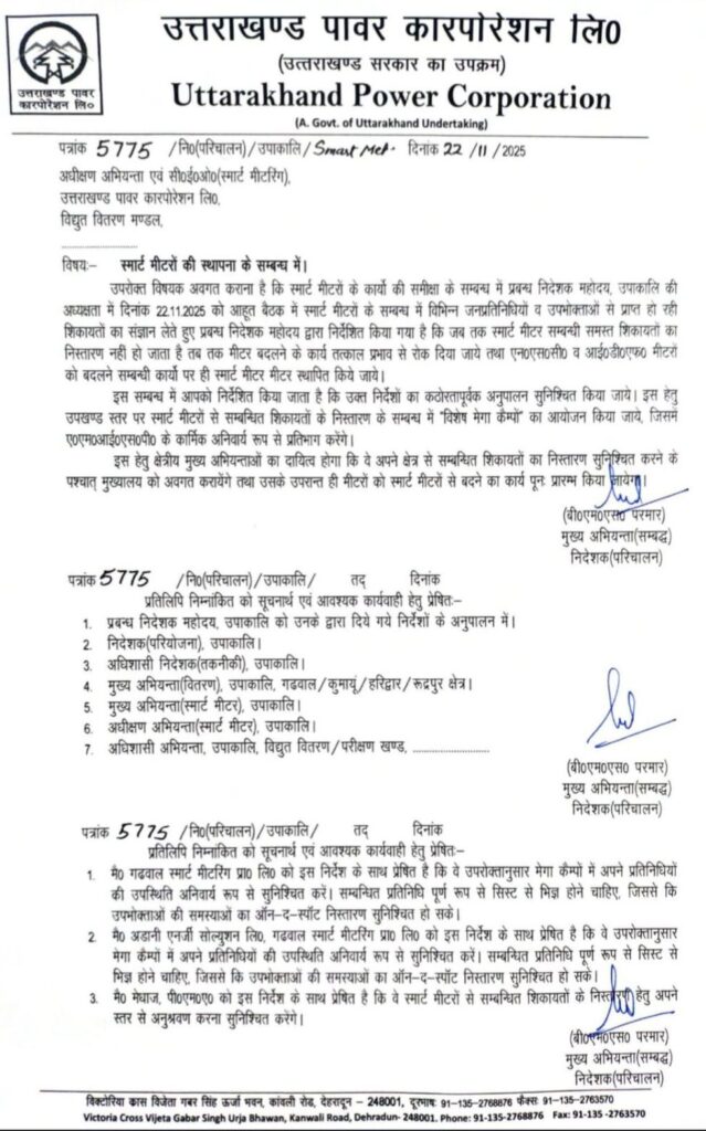 उक्त आदेश जारी करते हुए उत्तराखंड पावर कारपोरेशन के मुख अभियंता (सम्बद्ध) निदेशक परिचालन ने कहा है कि स्मार्ट मीटरो के कार्यों की समीक्षा के संबंध में प्रबंध निदेशक उपकालि की अध्यक्षता में दिनांक 22.11.2015 को आहूत बैठक में स्मार्ट मीटर के सम्बन्ध में विभिन्न जनप्रतिनिधियों व उपभोक्ताओं से प्राप्त हो रही शिकायतों का संज्ञान लेते हुए प्रबन्ध निदेशक द्वारा निर्देशित किया गया है कि जब तक स्मार्ट मीटर सम्बन्धी समस्त शिकायतों का निस्तारण नहीं हो जाता है तब तक मीटर बदलने के कार्य तत्काल प्रभाव से रोक दिया जायें तथा एनएससी व आईडीएफको बदलने संबंधी कार्यों पर ही स्मार्ट मीटर स्थापित किये जायें।